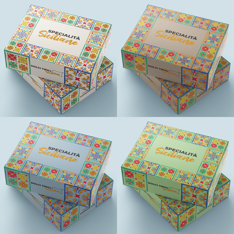 Le scatole per le paste di mandorla vengono proposte in due formati con quattro colori differenti tutti con motivi tipici siciliani.