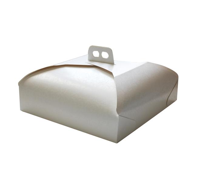 Le scatole per torta vengono proposte in tinta bianco damascato e in diverse misure: Rettangolari o quadrate.